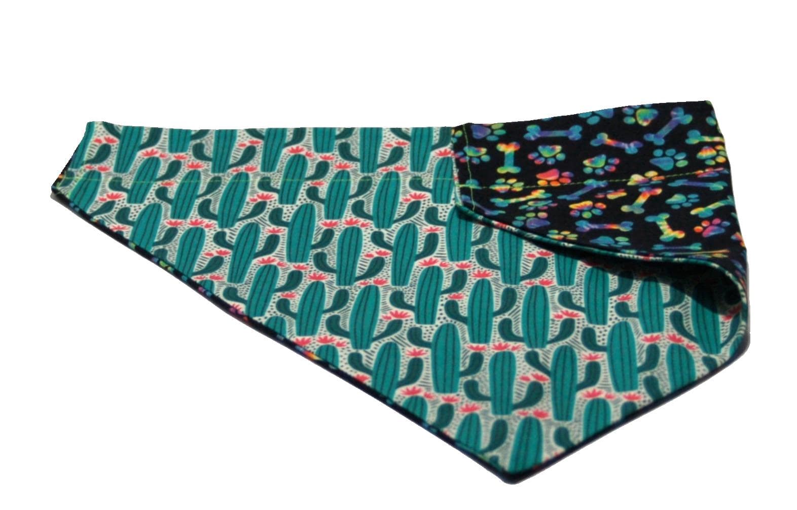 A stylish and functional dog bandana that easily slides onto your pet’s collar. Made from high-quality, durable fabric, this bandana is designed to stay in place without the need for tying. It features a convenient opening that allows you to slip it over the collar, ensuring a secure and comfortable fit for your furry friend. Perfect for adding a touch of flair to your dog’s everyday look or for special occasions. Bandanas are reversible, giving your dog two styles in one.