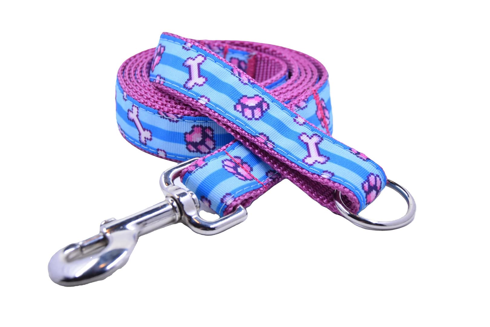 4 Paws Studio’s dog leashes are designed for durability, safety, and comfort. Available in 6-foot or 4-foot lengths and 1” or 3/4” widths, they feature a flexible hand loop with a ring for keys or waste bags, and an easy-swivel stainless snap hook for attaching to collars or harnesses.